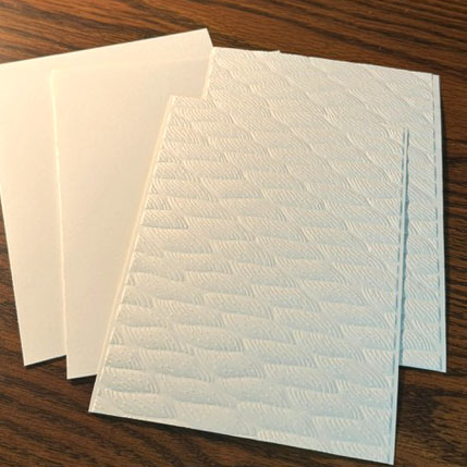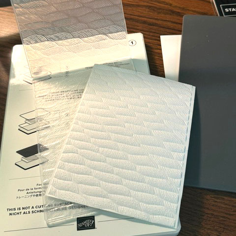 - Optional – add a 4.375″ x 5.875″ white embossed panel to front of card. The retired Twisted Rope embossing folder is used in the example, but any embossing folder would work such as So Swirly Embossing folder.