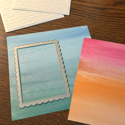 - Cut a smaller panel approximately 4″ x 5″ from Full of Life designer series paper or any ombre colored paper and adhere to the front of the card. The example rectangle is cut with retired Color and Contour die, but any rectangular die will work. The Everyday Details dies would be perfect or simply use a straight edge rectangle.