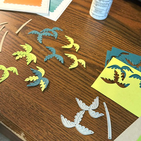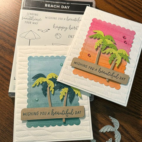 - Using the Beach Day dies cut palm tree tops from green cardstock and palm trunks from brown cardstock. Example uses Pretty Peacock, Lemon Lime Twist, Granny Apple Green and Crumb Cake.
