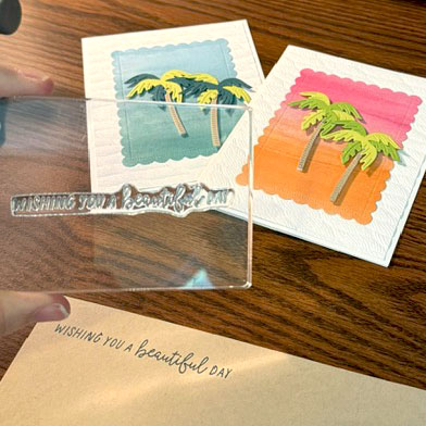- Stamp a “summer” sentiment on brown or white cardstock. Add Stampin’ Dimensionals and adhere over the palm trees.