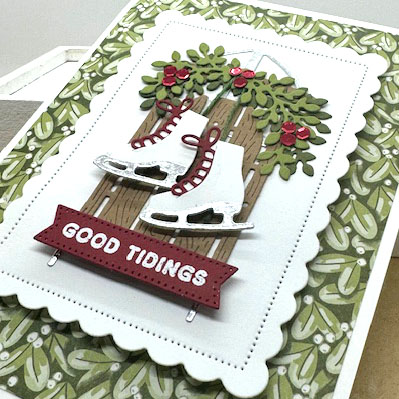 This card showcases a wooden sled, skates, and greenery, all die cut using the Sophisticated Sled dies (check out my latest YouTube tutorial below for step by step how to create the sled and skates). The background is Season of Green & Gold DSP.