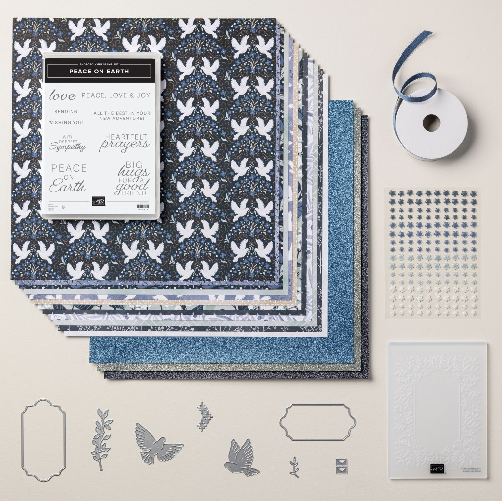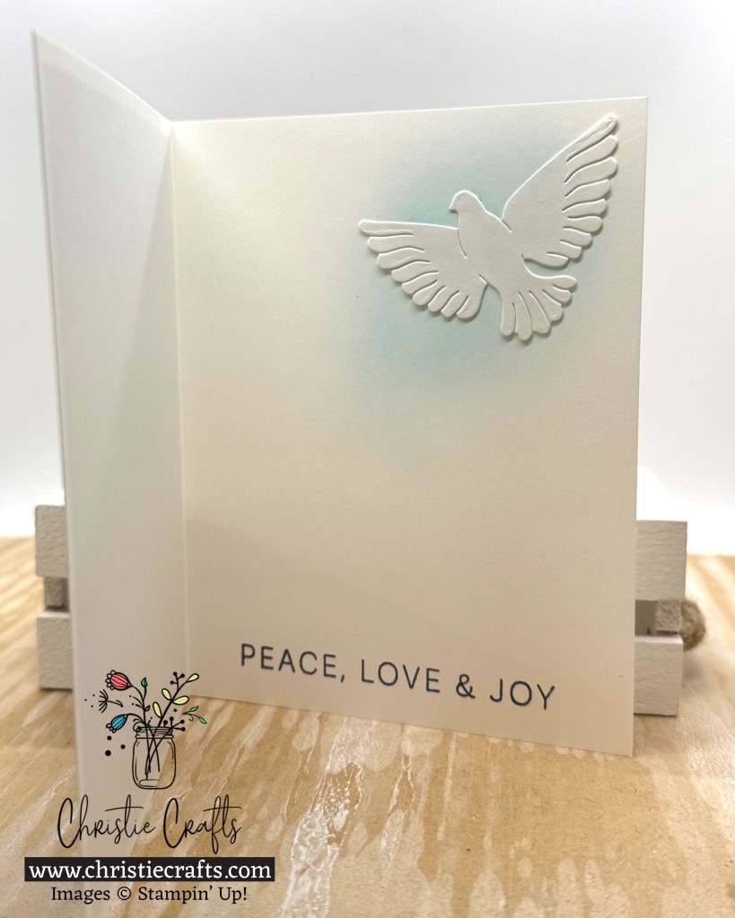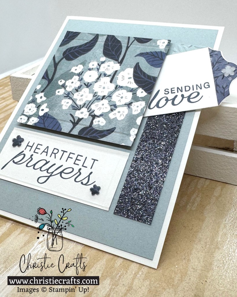 This soft and elegant card combines leafy designer paper, embossed texture, and layered die-cuts for a peaceful design that feels both fresh and thoughtful. A Misty Moonlight panel anchors the card front, while the sentiment label, dove, and delicate accents add charm and dimension. It’s finished with a handmade coordinating envelope to make your message even more meaningful.