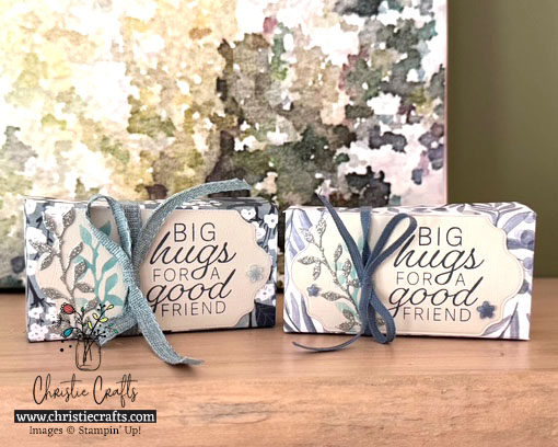 These pretty handmade boxes are as beautiful as the thoughtful intentions behind the gifts inside! Created with floral designer paper, each one features a custom stenciled label with soft Balmy Blue ink blending and shimmering sprig die-cuts. Finished with coordinating blue ribbons and Hues of Blue Flowers embellishments, they’re perfect for holding a small treat or gift with a big wow factor.