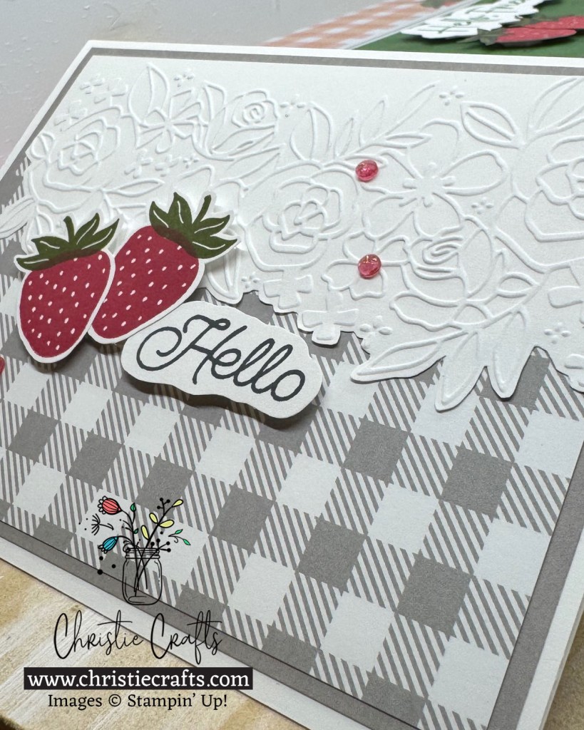 For this fresh take, I started with a white card base and layered it with the gray gingham and a panel of Smoky Slate cardstock. Next, I embossed a piece of white cardstock using the Glass & Gardens Embossing Folder and fussy-cut along the edge to create a lovely textured design feature. I stamped and fussy-cut two strawberries with the Sweeter With You stamp set, then popped them up with dimensionals and added the “Hello” sentiment. To finish, I sprinkled on a few Strawberry Slush & Pretty in Pink Gems for just the right touch of sparkle.