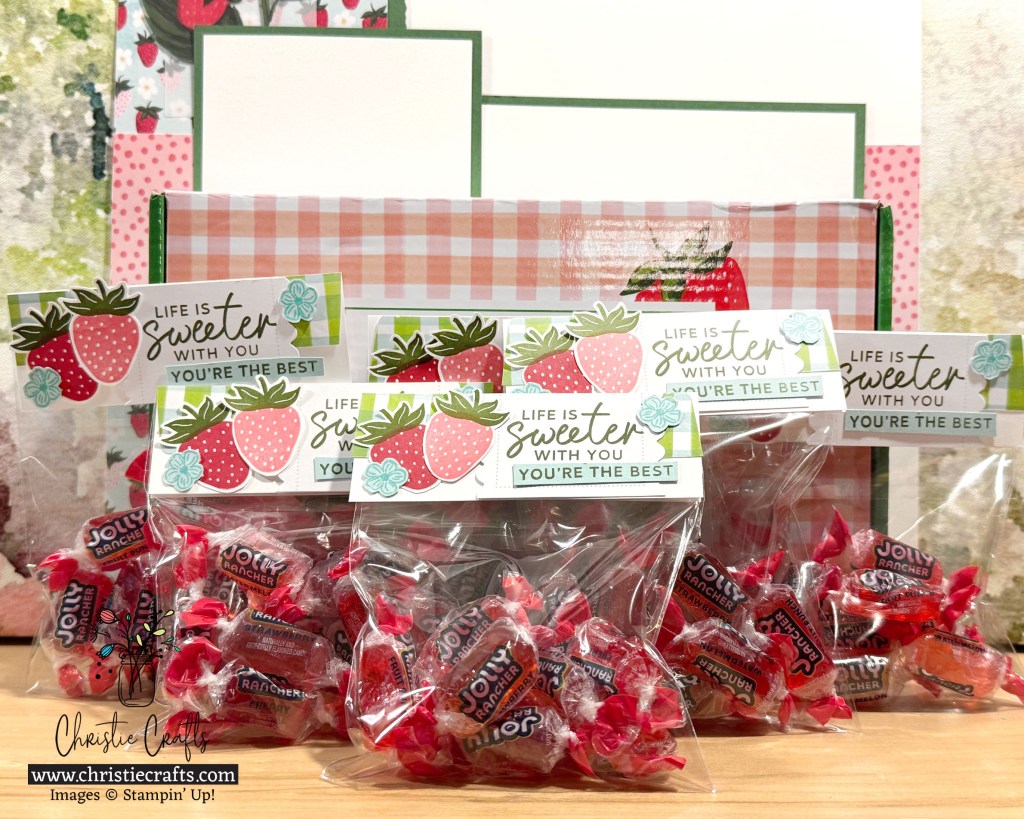 In addition to the cards, I used the kit materials to create an adorable scrapbook page—perfect for documenting a day at the strawberry patch—and some yummy treat bags, just the right size for red Jolly Ranchers. I even found a way to use the kit packaging, so nothing went to waste!