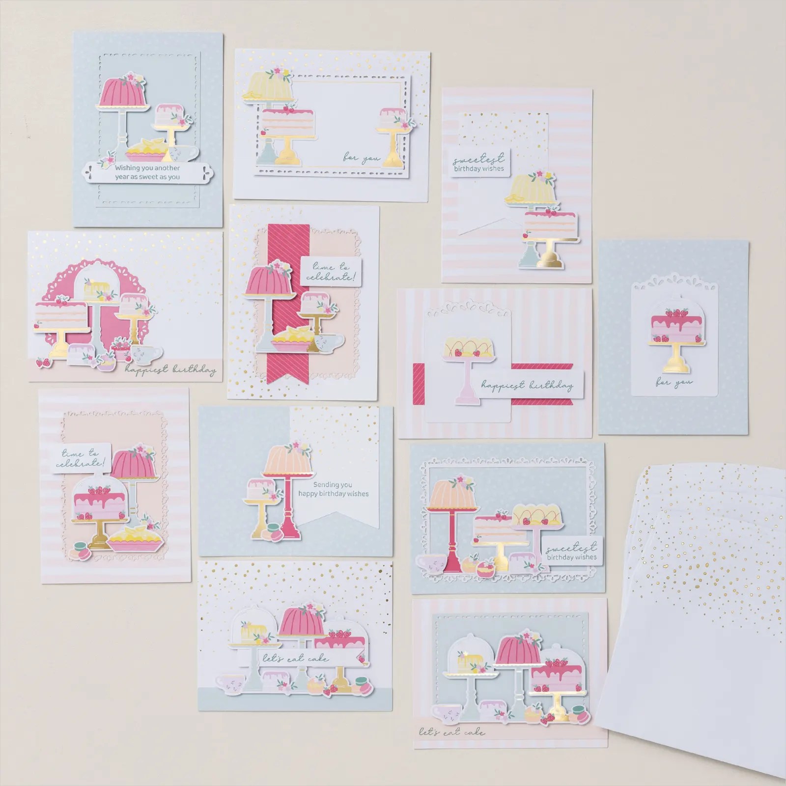 The Birthday Fancy Kit makes 12 unique cards, each with coordinating envelopes and elegant gold foil accents. In the kit you’ll find the Birthday Fancy photopolymer stamp set, a clear stamp block, a Lost Lagoon Classic Stampin’ Spot, and step-by-step instructions—plus plenty of printed die-cut pieces ready to layer up. The dreamy color palette includes Darling Duckling, Fresh Freesia, Lost Lagoon, Petal Pink, Strawberry Slush, and a touch of gold.
