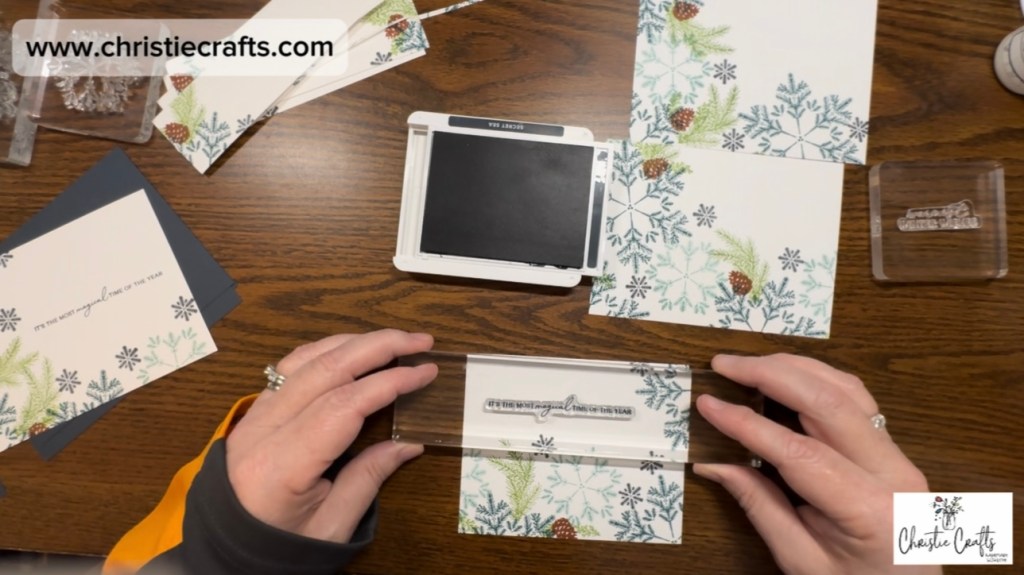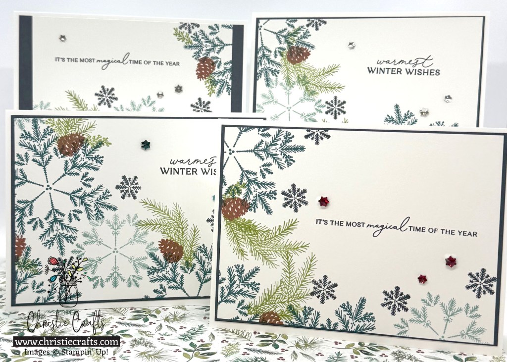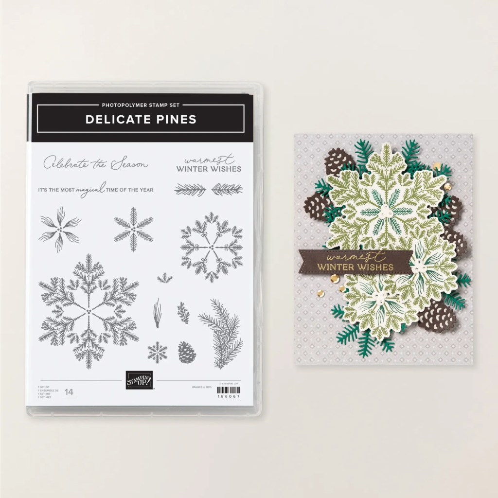 Hey y’all! Let’s make a one-sheet wonder with the Delicate Pines Stamp Set. If you’ve been around Christie Crafts for a while, you know I love a good One-Sheet Wonder, and the Delicate Pines Stamp Set is just perfect for this kind of project! The soft, wintry snowflakes and pine sprigs and cones make it perfect for creating a beautifully coordinated set of cards in no time.