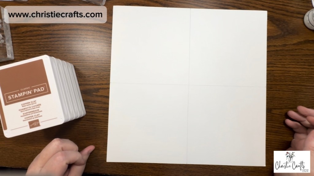 This technique starts with a full 12″ x 12″ or 12″ x 9″ sheet of white cardstock. Make a light pencil line horizontally and vertically so you have a nice crosshair in the center.