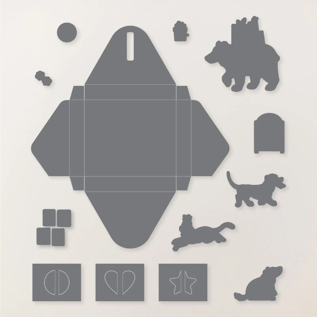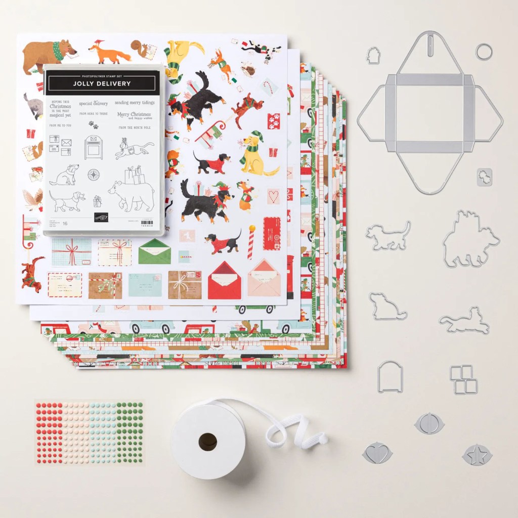 The Jolly Delivery Stamp Set pairs perfectly with the coordinating Jolly Delivery Dies, which not only cut out the stamped images but also create an adorable little treat box (see the quick video below).
